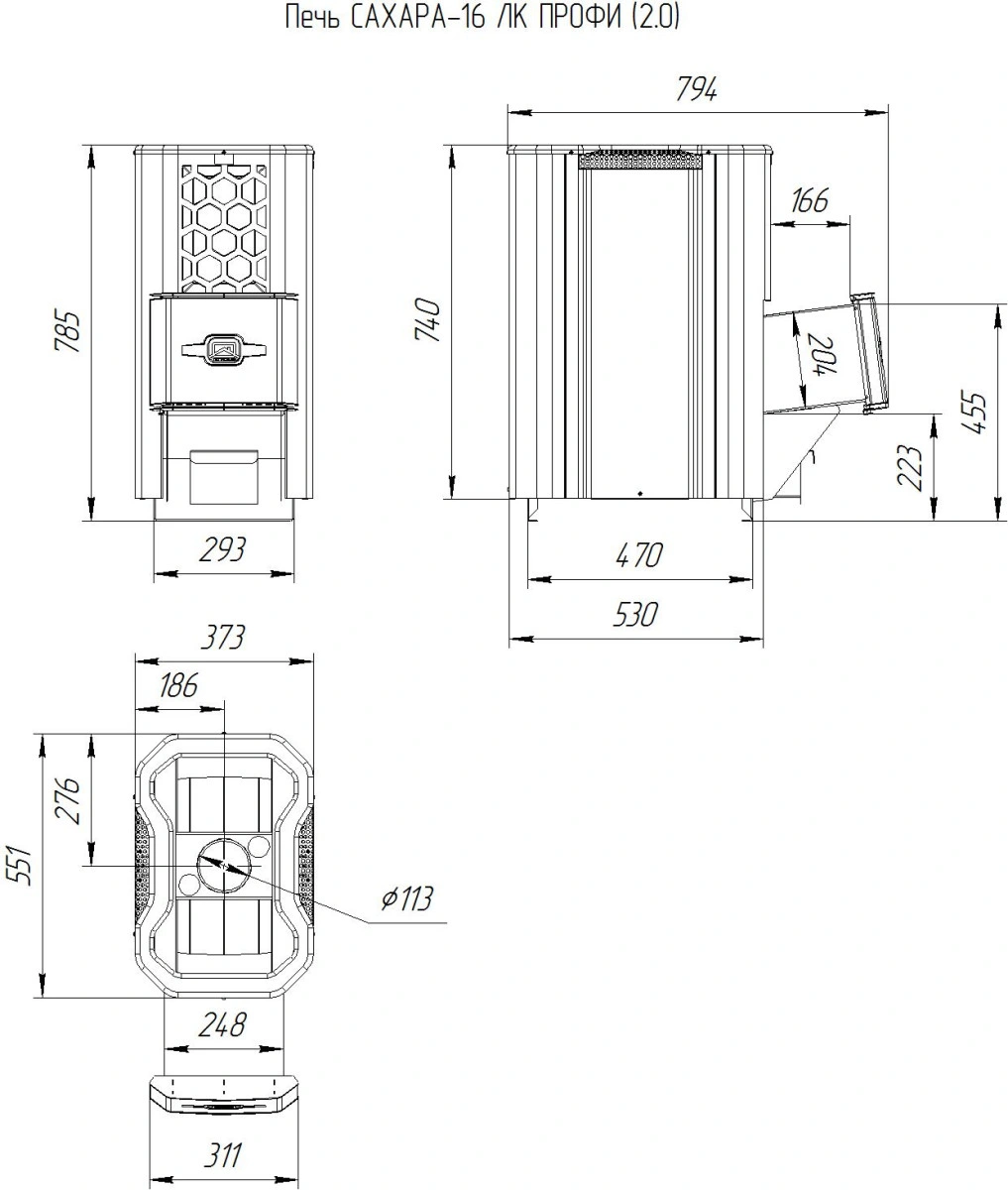 Важно: дымоход и камни для печи приобретаются отдельно — они не входят в стандартный комплект.