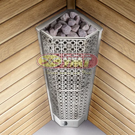 Благодаря угловому исполнению, печь оптимально вписывается в пространство парильного помещения, позволяя сэкономить полезную площадь. При компактных габаритах модель отличается вместительностью — она способна вместить значительное количество камней, что обеспечивает равномерное распределение и длительное сохранение тепла в сауне.