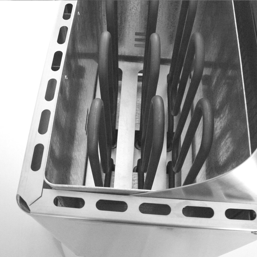 Конструкция прибора включает прочный корпус с внутренней камерой, где размещены трубчатые электронагреватели. Для оптимальной работы в камеру укладывают камни диаметром 8–10 см — до верхнего края корпуса.