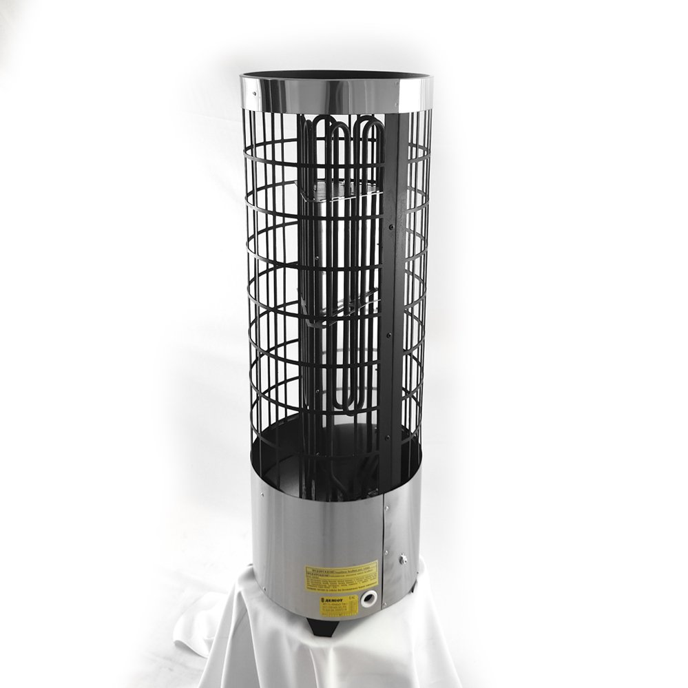 Особенность модели — цилиндрическая форма с прямоугольными сетчатыми вырезами по всей поверхности. Такая конструкция обеспечивает равномерный и комфортный нагрев помещения. Интенсивность тепла легко регулировать: чтобы усилить эффект, достаточно добавить воды — на боковую поверхность каменки или непосредственно на камни.