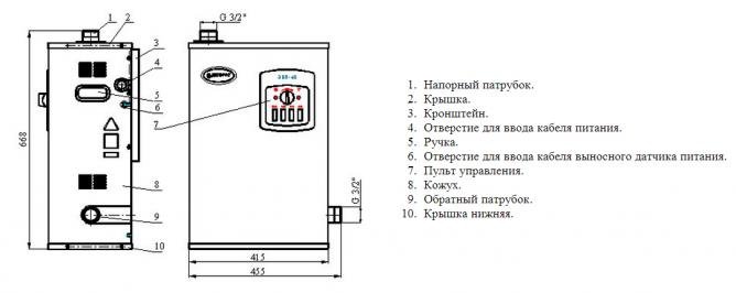 Котёл выполнен в стальном корпусе, внутри которого размещён резервуар с электронагревателями. Управление осуществляется через встроенный пульт, позволяющий регулировать мощность и температуру теплоносителя.