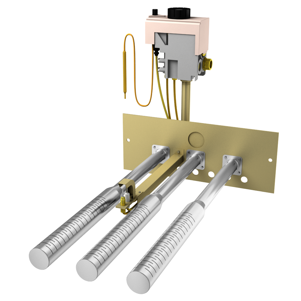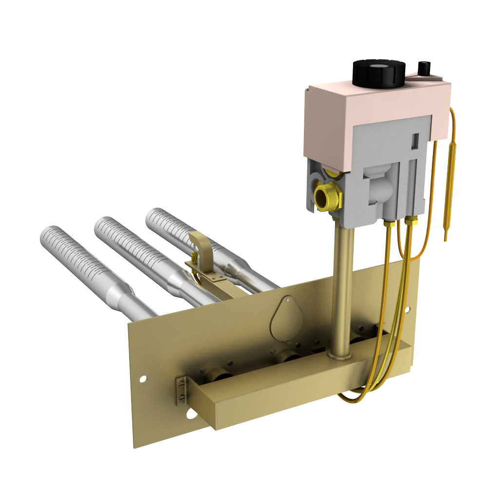 Газ через штуцера подвода поступает в автоматику, далее из коллектора через сопла истекает в насадки основной горелки, частично инжектируя воздух для горения. Вторичный воздух поступает через щелевые отверстия шибера. Устройство снабжено автоматикой регулирования и безопасности