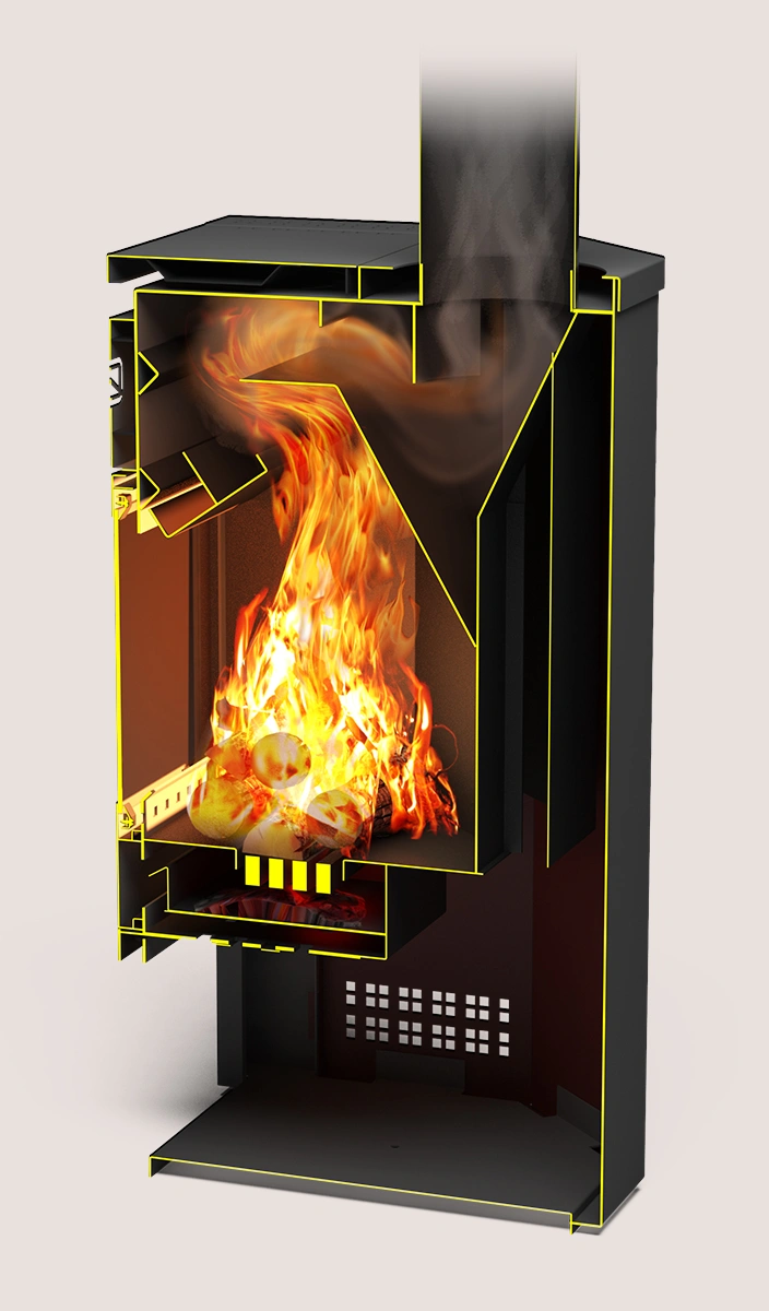 Основу устройства составляет топка из жаростойкой нержавеющей стали, скрытая за декоративным конвектором. Конвектор не только придаёт камину привлекательный внешний вид, но и способствует быстрому прогреву помещения за счёт конвекционных потоков воздуха.