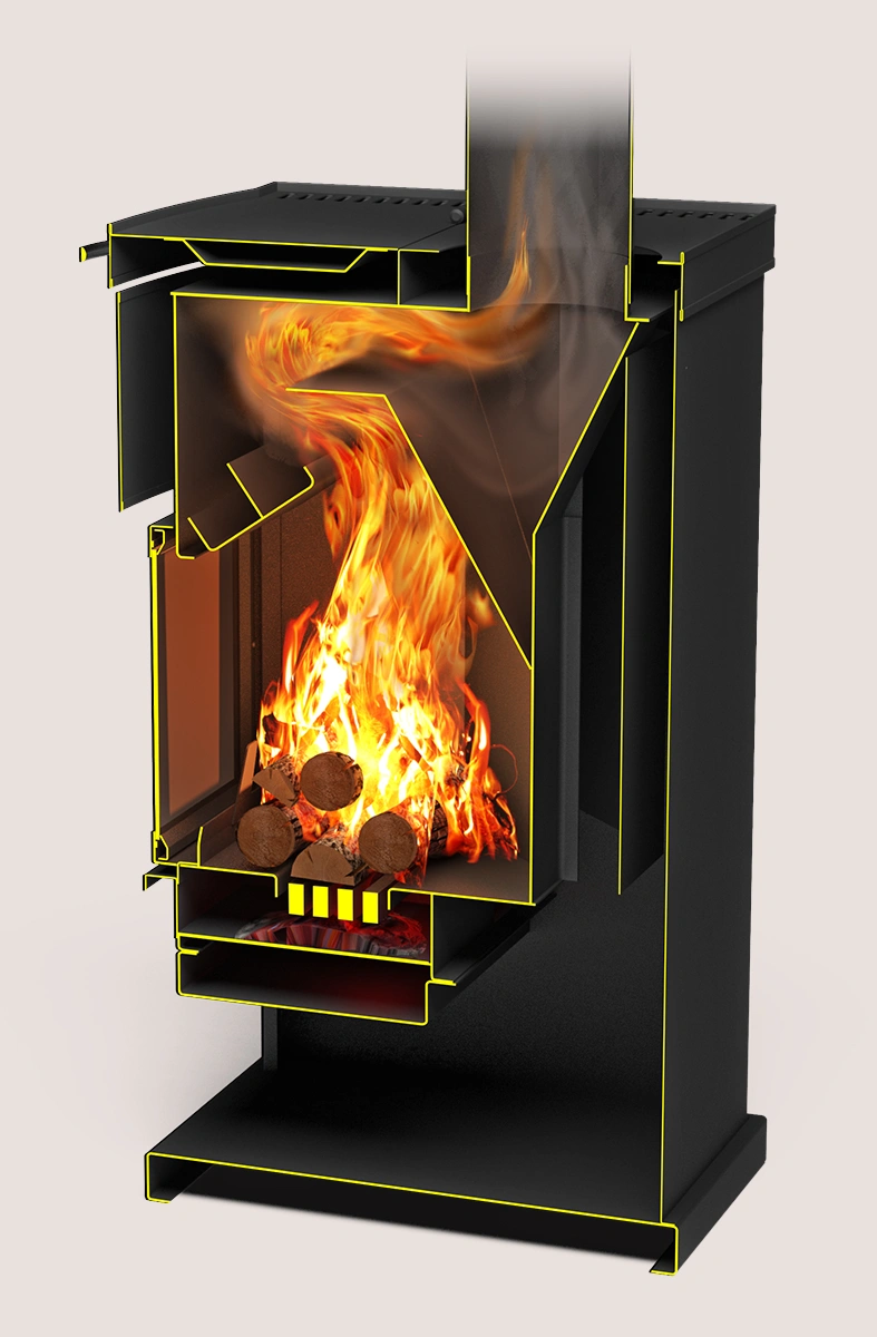 Устройство сочетает в себе функции камина и отопительной печи. Благодаря продуманной конструкции оно не только создаёт уютную атмосферу, но и обеспечивает равномерный прогрев воздуха в помещении. Варочная плита, скрытая под декоративной крышкой, позволяет готовить или разогревать пищу прямо на камине.