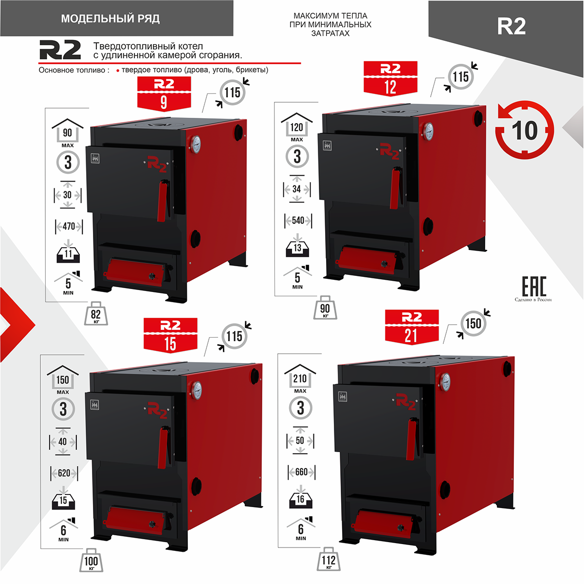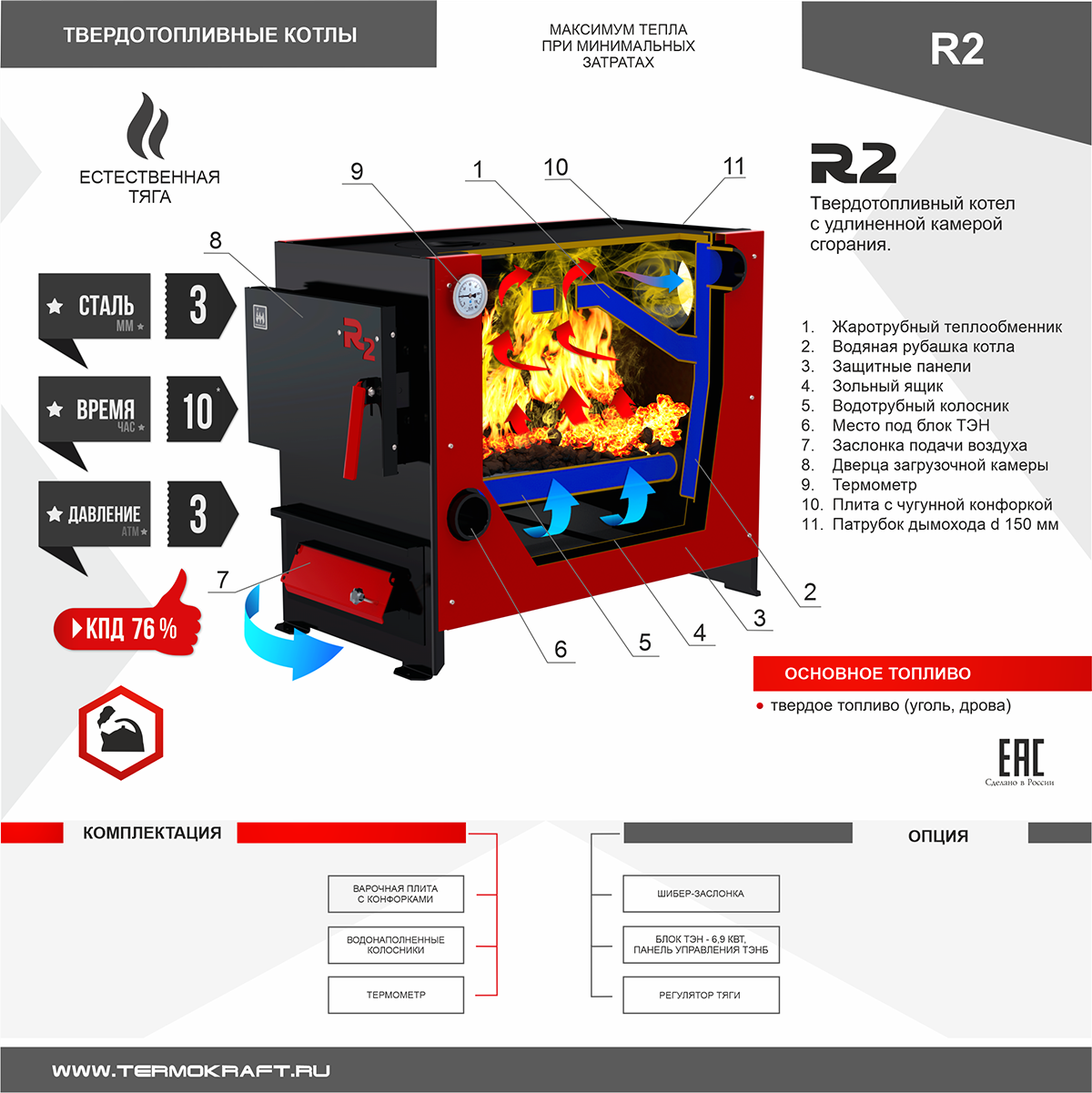 - Совместимость: возможность работы на различных видах твёрдого топлива (дрова, уголь, брикеты)