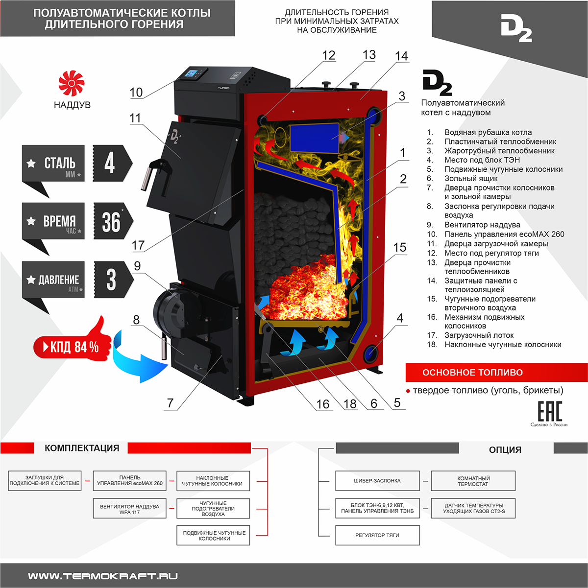 - Совместимость: поддержка различных видов угля (чёрный, бурый) и возможность установки блока ТЭН