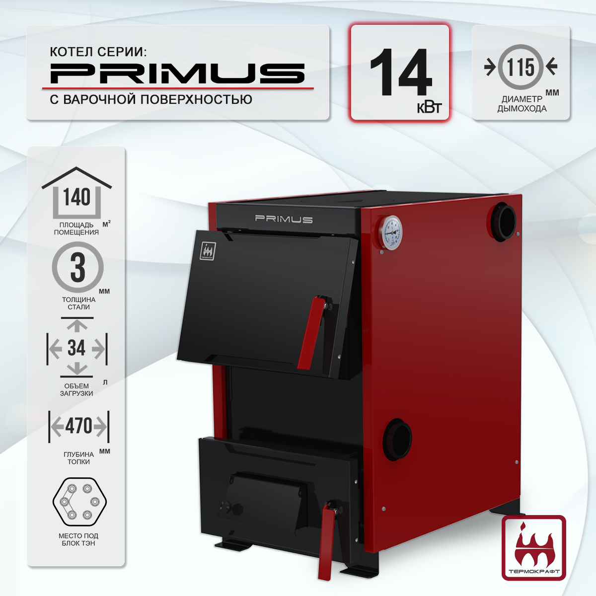 Котел твердотопливный PRIMUS 14 кВт представляет собой современное отопительное оборудование, разработанное для эффективного обогрева частных домов и объектов коммунально-бытового назначения. Оборудование успешно интегрируется в системы водяного отопления с различными типами циркуляции и оснащено функцией приготовления пищи, что делает его универсальным решением для домашнего использования.