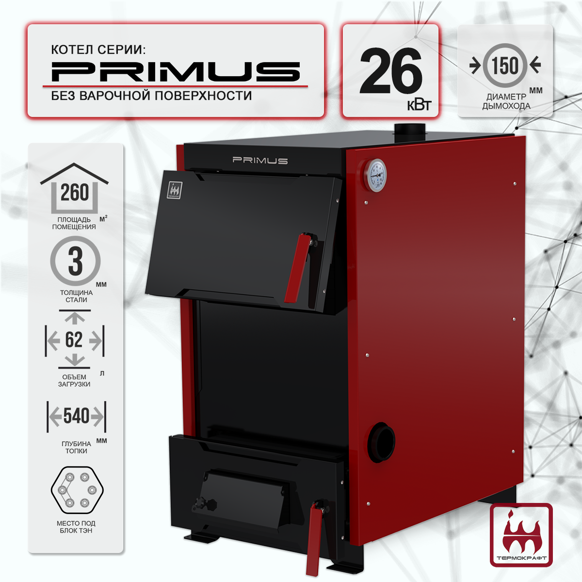 Котел твердотопливный PRIMUS B 26 кВт представляет собой современное отопительное оборудование, разработанное для эффективного обогрева частных домов и объектов коммунально-бытового назначения. Оборудование успешно интегрируется в системы водяного отопления с различными типами циркуляции и обеспечивает не только комфортный микроклимат в помещении, но и возможность приготовления пищи.