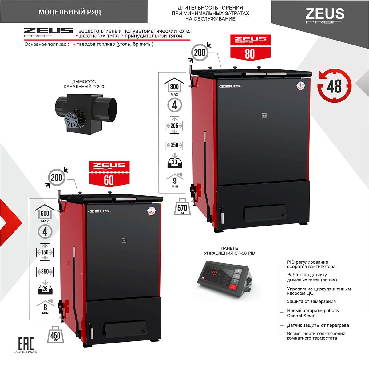 Котел твердотопливный ZEUS («Зевс») 80 кВт + дымосос с принудительной тягой представляет собой современное отопительное оборудование, разработанное для эффективного обогрева жилых и производственных помещений. Модельный ряд включает котлы мощностью 60 и 80 кВт, способные обслуживать площади от 460 до 800 квадратных метров. Оборудование совместимо с системами водяного отопления как с естественной, так и с принудительной циркуляцией.
