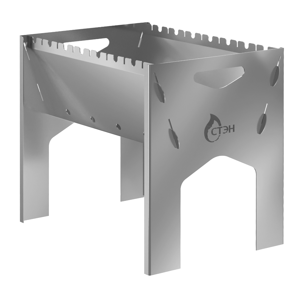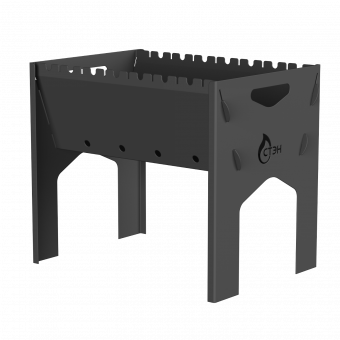 Надёжная толщина стенок уменьшает деформацию металла и увеличивает срок службы мангала, а также делает жар углей более равномерным. Стойки имеют прорезные ручки для переноски мангала в собранном виде.