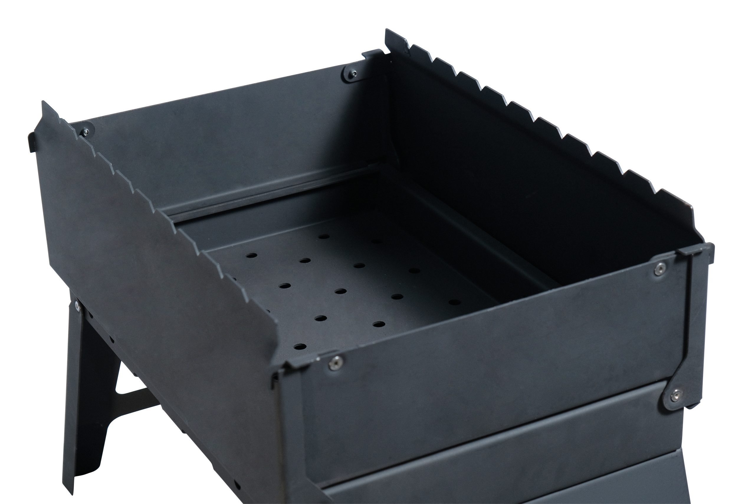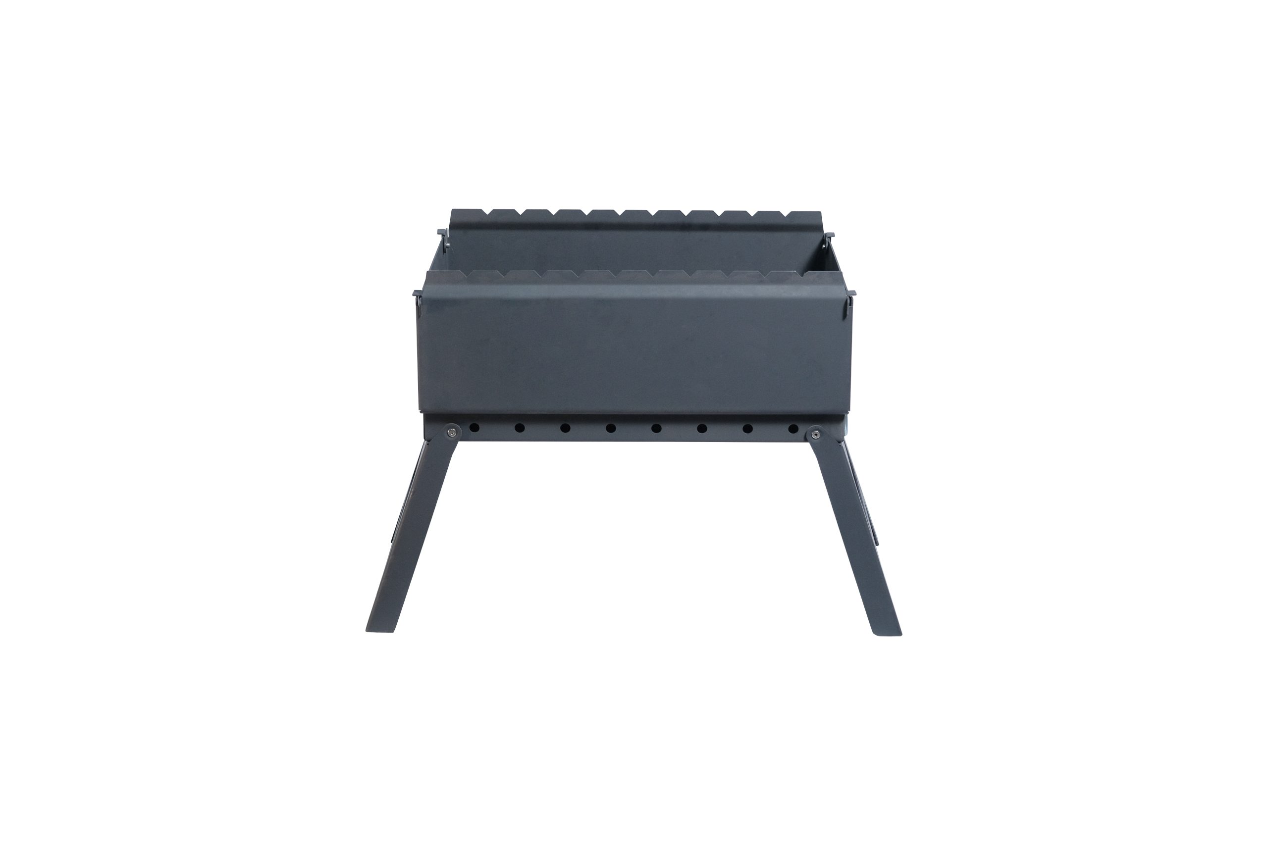 Конструкция мангала сочетает практичность и удобство: он легко трансформируется из рабочего состояния в компактную коробку, а встроенная ручка упрощает транспортировку. Всё это позволяет брать мангал с собой в поездки без лишних хлопот.