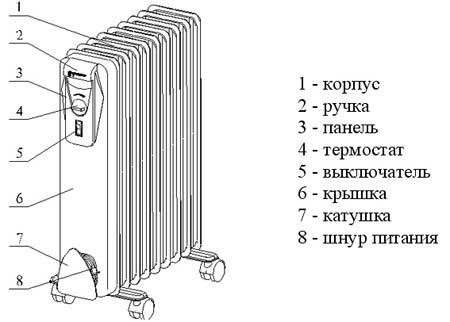 Масляный обогреватель ЭРМПБ-1,5 представляет собой радиатор с герметичным корпусом, который состоит из ряда последовательно соединённых секций, заполненных теплопередающей жидкостью. В нижней части корпуса размещён ТЭН, защищённый крышкой.