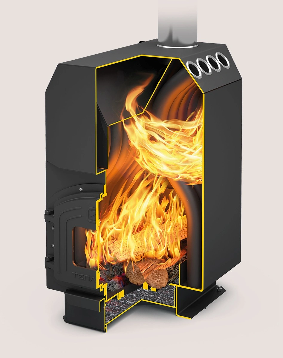 - Инновационность: трёхоборотная топка и система дожигателей позволяют перевести печь в режим длительного горения, повышая эффективность использования топлива.