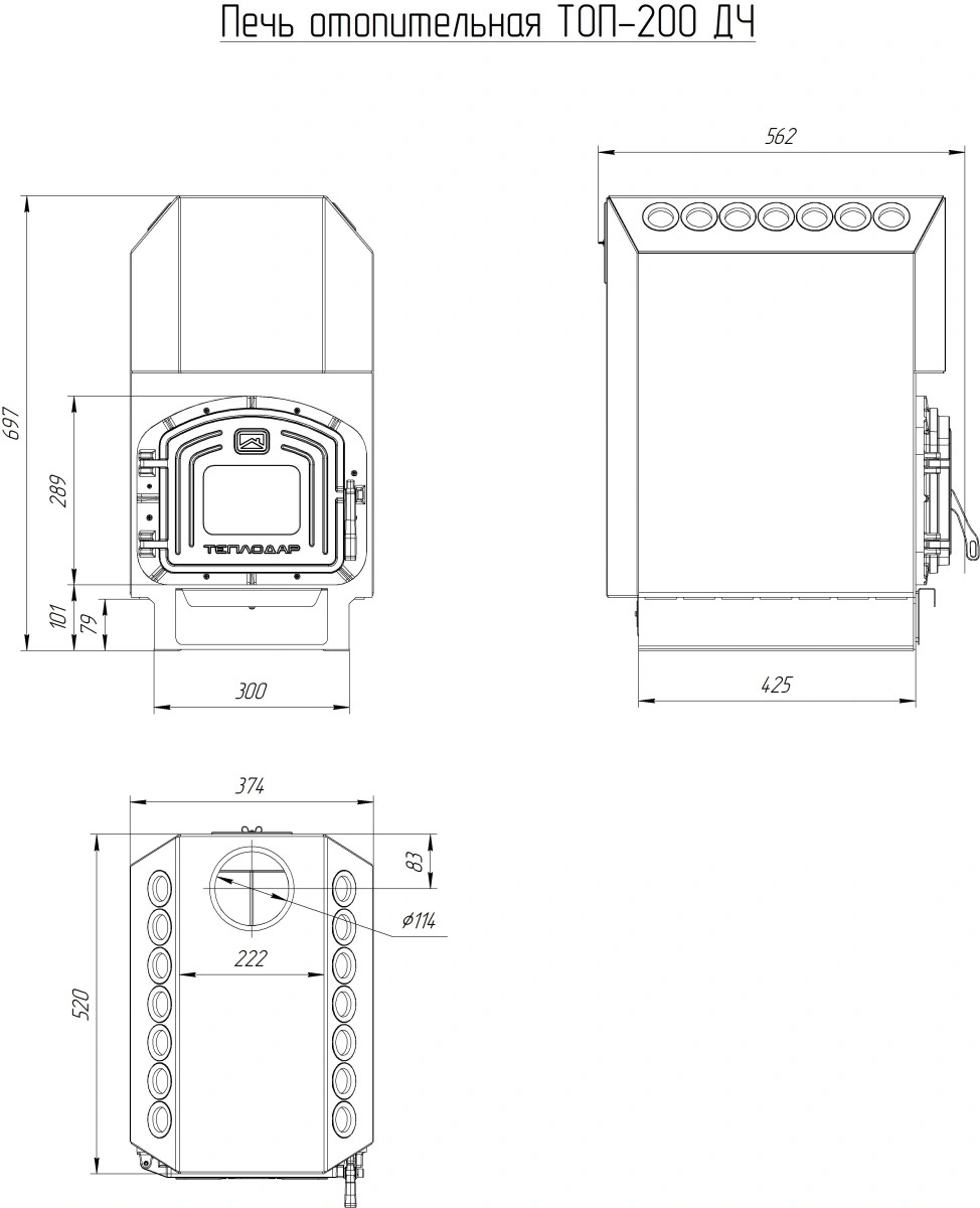 - Адаптивность: возможность дополнения печи приставкой для принудительной конвекции «Турбо-ТОП» (для модификации ТОП‑200) и навесным теплосъёмником (приобретается отдельно) для обогрева смежных помещений.