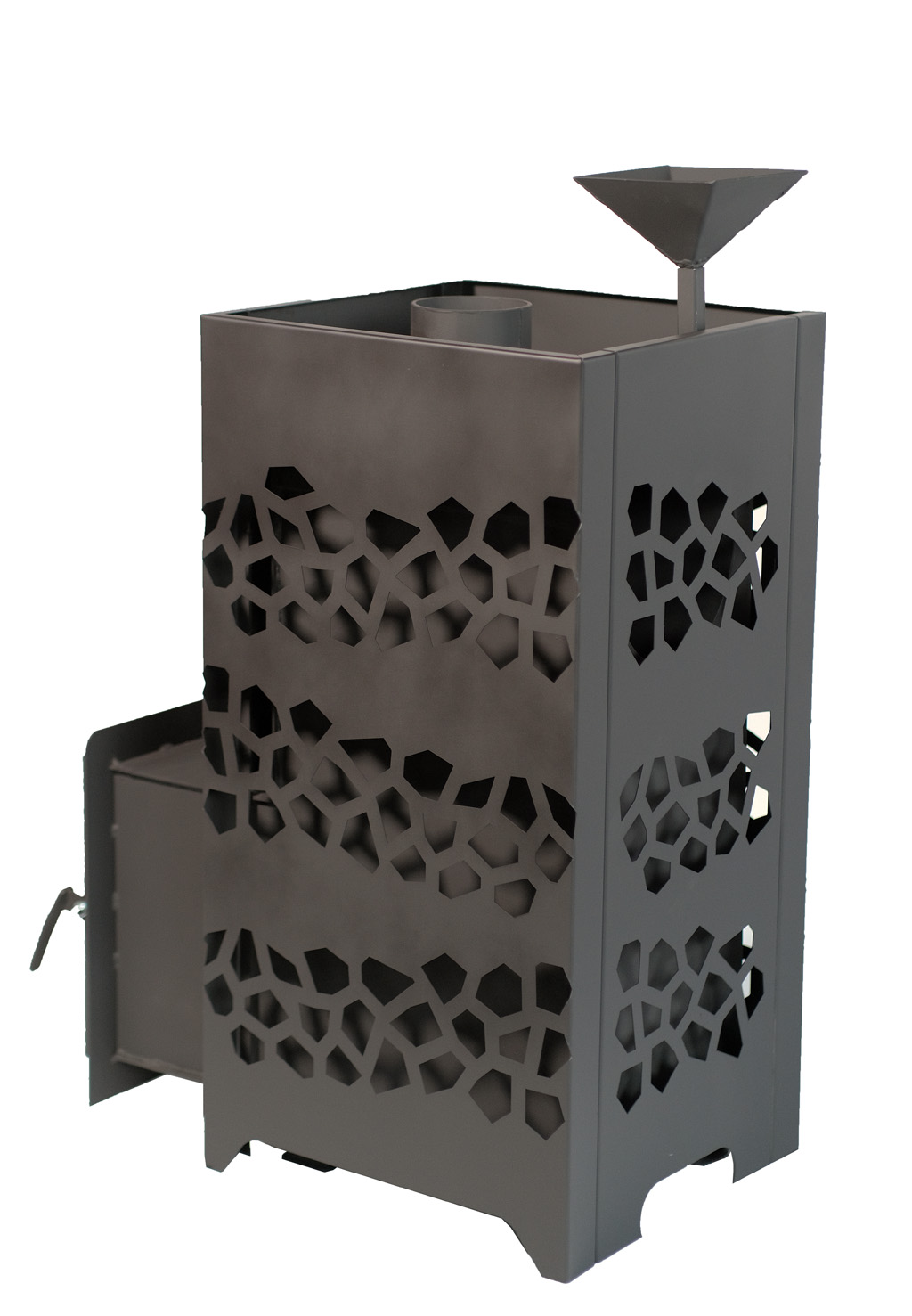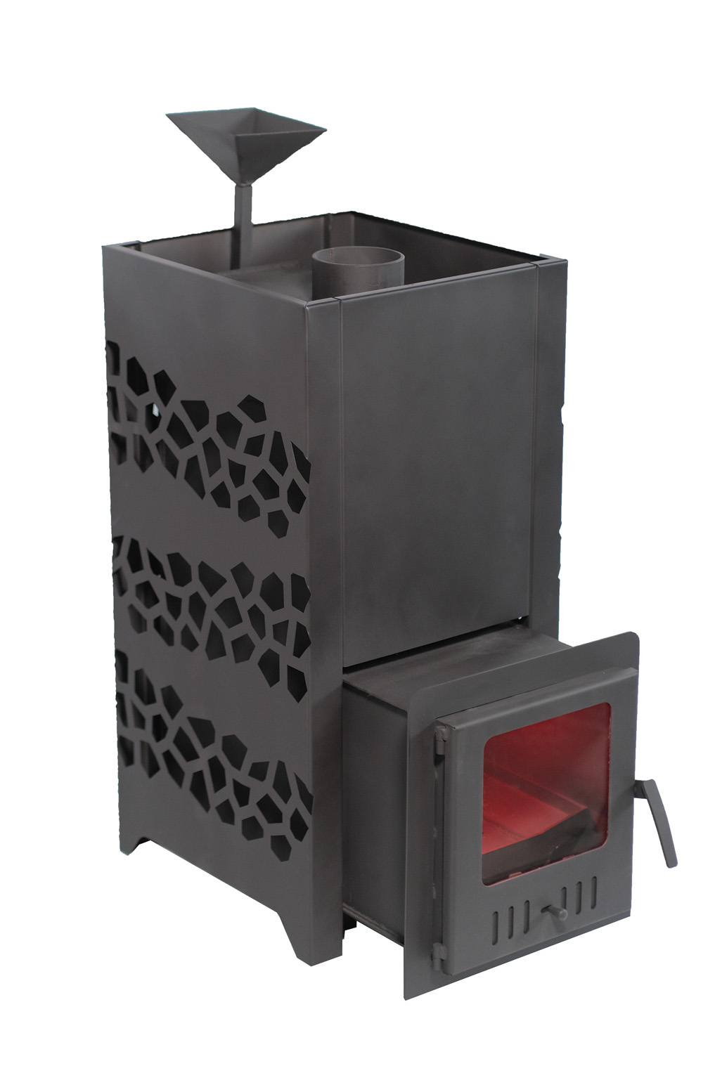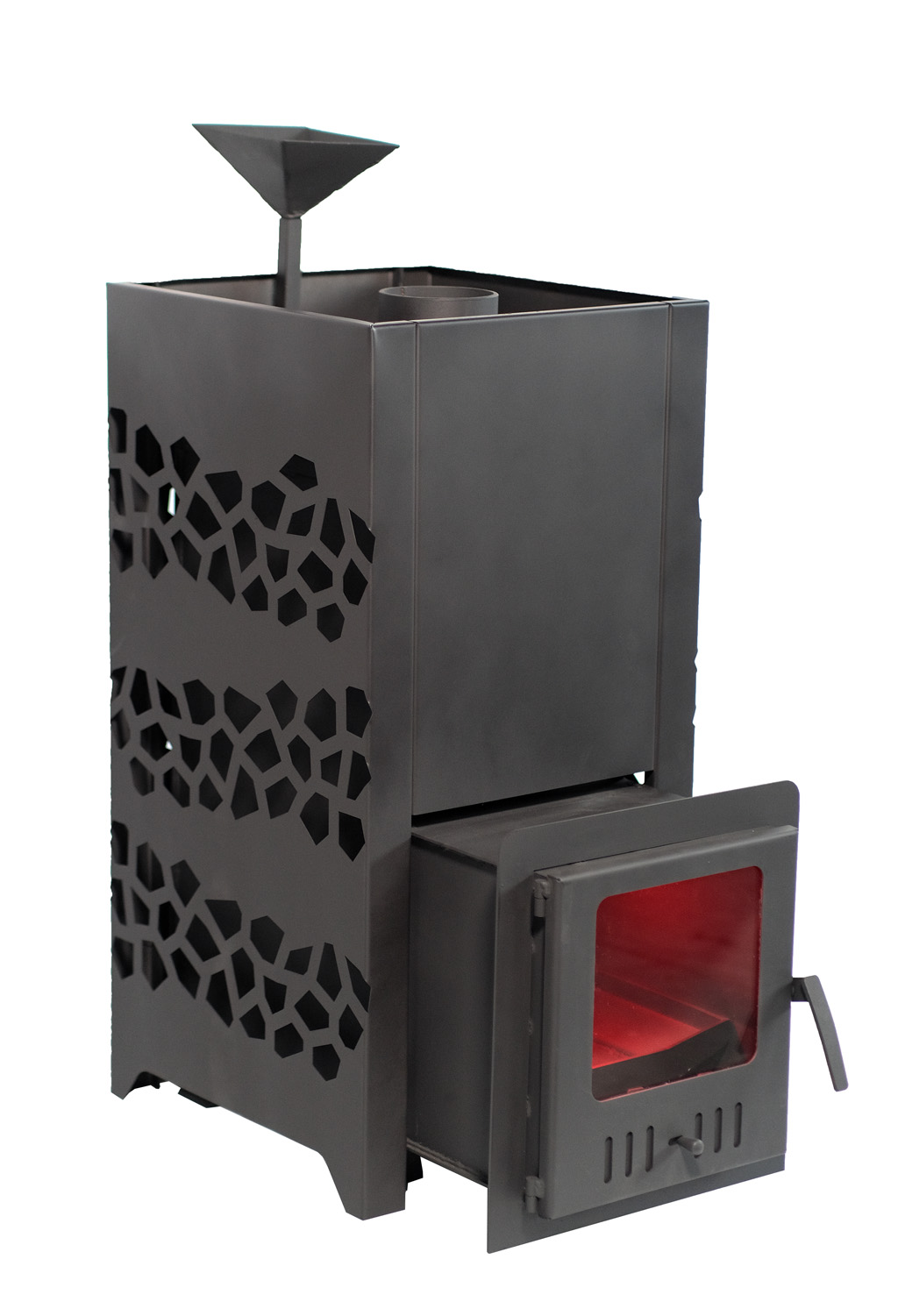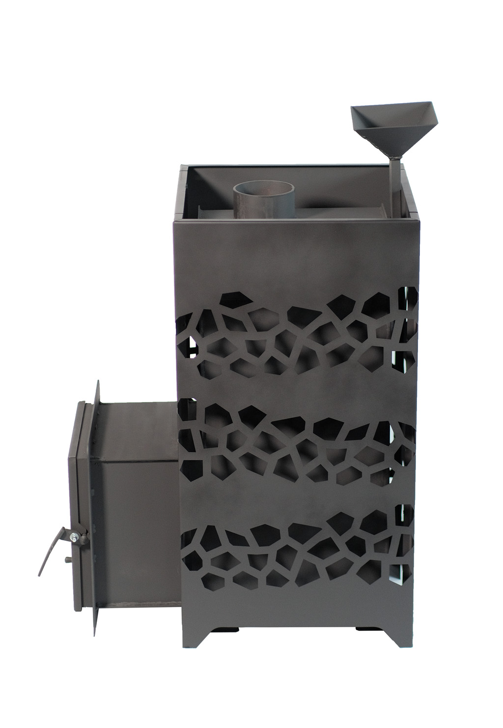 - Удобство: глубокая топочная камера подходит для поленьев разных размеров, а воронка для подачи воды упрощает получение качественного пара.