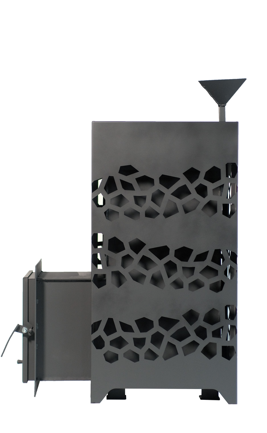 Ключевая особенность печи — эффективная система теплообмена. Она формирует мощный круговой конвекционный поток, благодаря которому воздух в парильном и смежных помещениях нагревается значительно быстрее. Это позволяет сократить время подготовки бани к использованию и поддерживать комфортную температуру на протяжении всего сеанса.