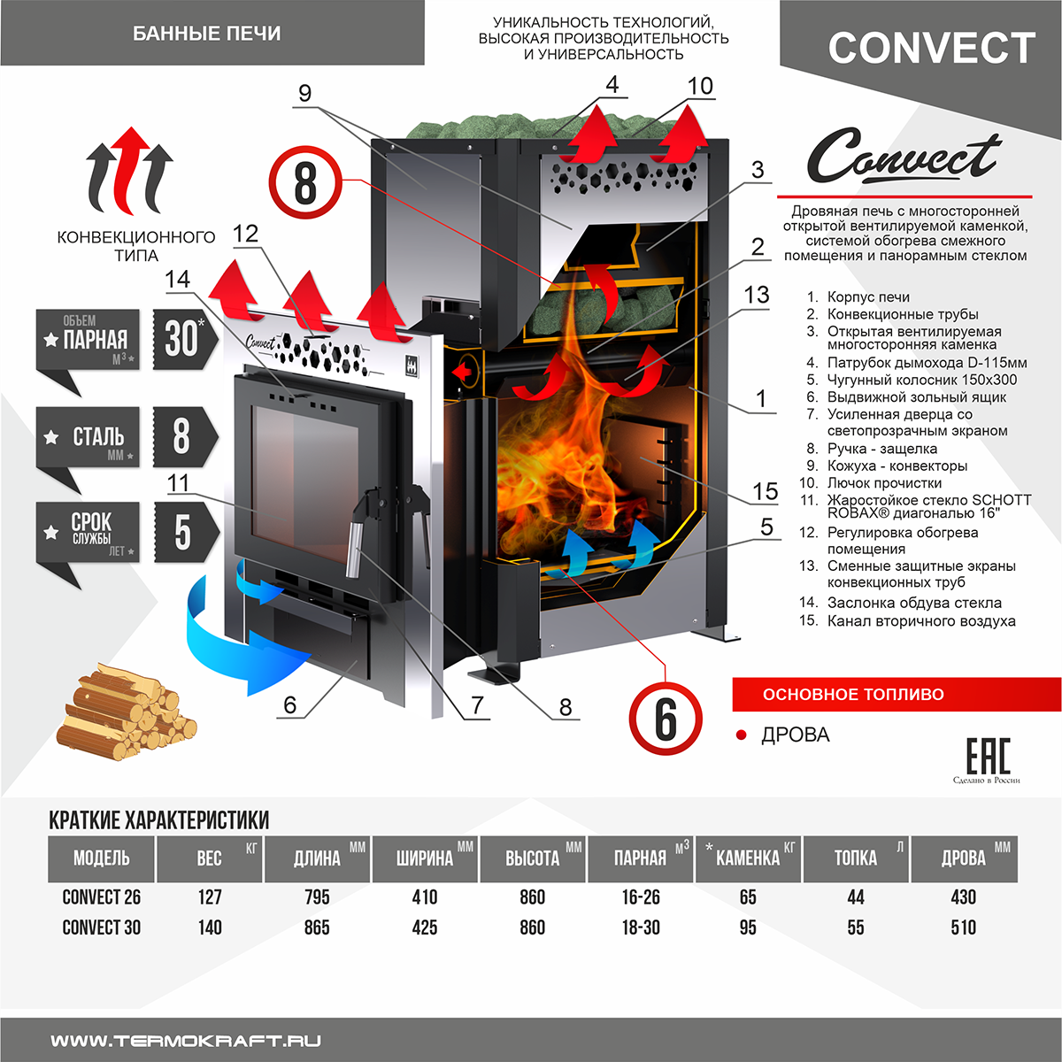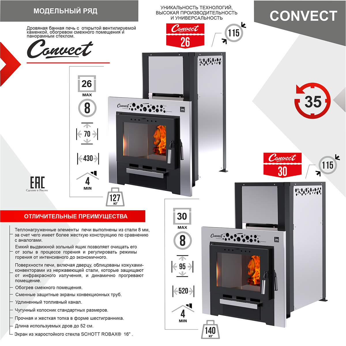 Универсальность конструкции позволяет использовать печь максимально эффективно: быстрый нагрев парного помещения, вместительная каменка и продуманная система распределения тепла делают CONVECT 30 идеальным выбором для современной бани.