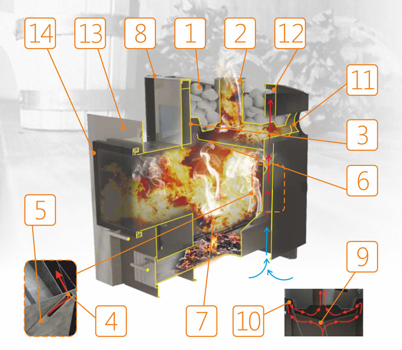 Конструкция печи продумана до мелочей: ключевые элементы топки и каменки, испытывающие максимальные термические и механические нагрузки, выполнены из коррозионно‑стойкой и жаропрочной стали с содержанием хрома не менее 13 %. Это гарантирует длительный срок службы и устойчивость к экстремальным условиям эксплуатации.