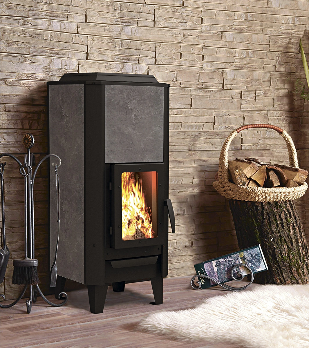 Особенность модели — вертикальная загрузка дров в топку, которая упрощает эксплуатацию и экономит пространство. Панорамная дверь с жаростойким стеклом SCHOTT ROBAX открывает прекрасный обзор живого огня, создавая уютную атмосферу в помещении.
