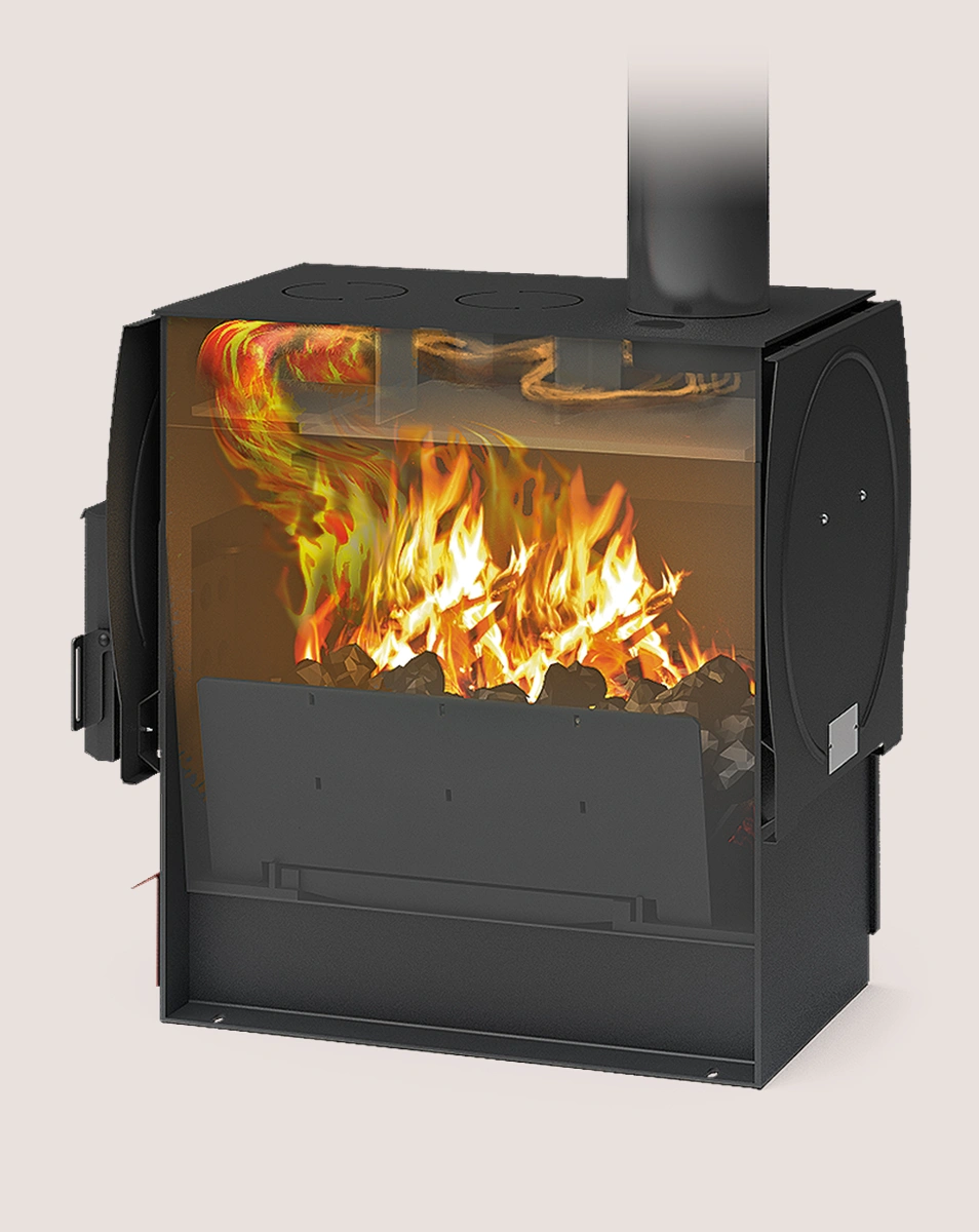 - Быстрый нагрев помещения: мощные конвекционные потоки в каналах между топкой и кожухом печи способствуют динамичному прогреву воздуха и его равномерному распределению.