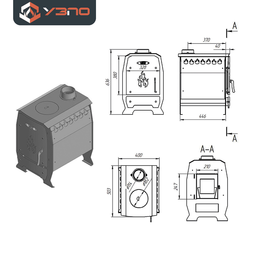 - Сменный чугунный колосник — повышает долговечность печи и облегчает обслуживание.