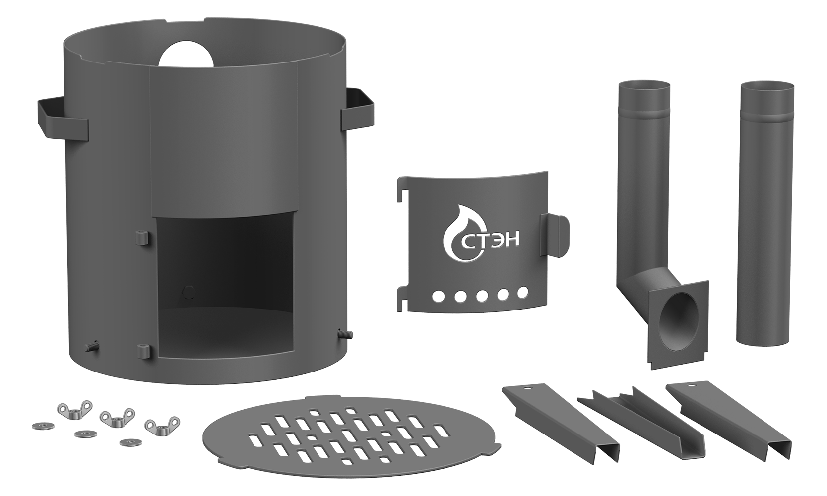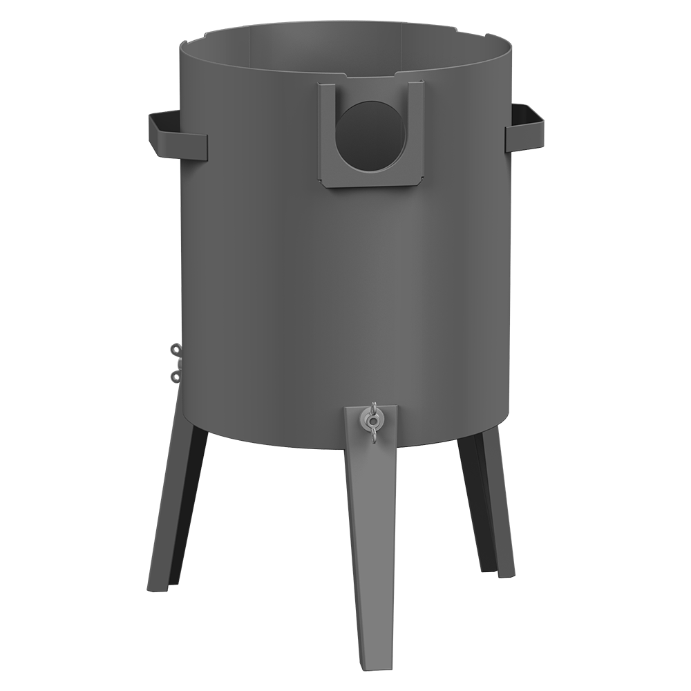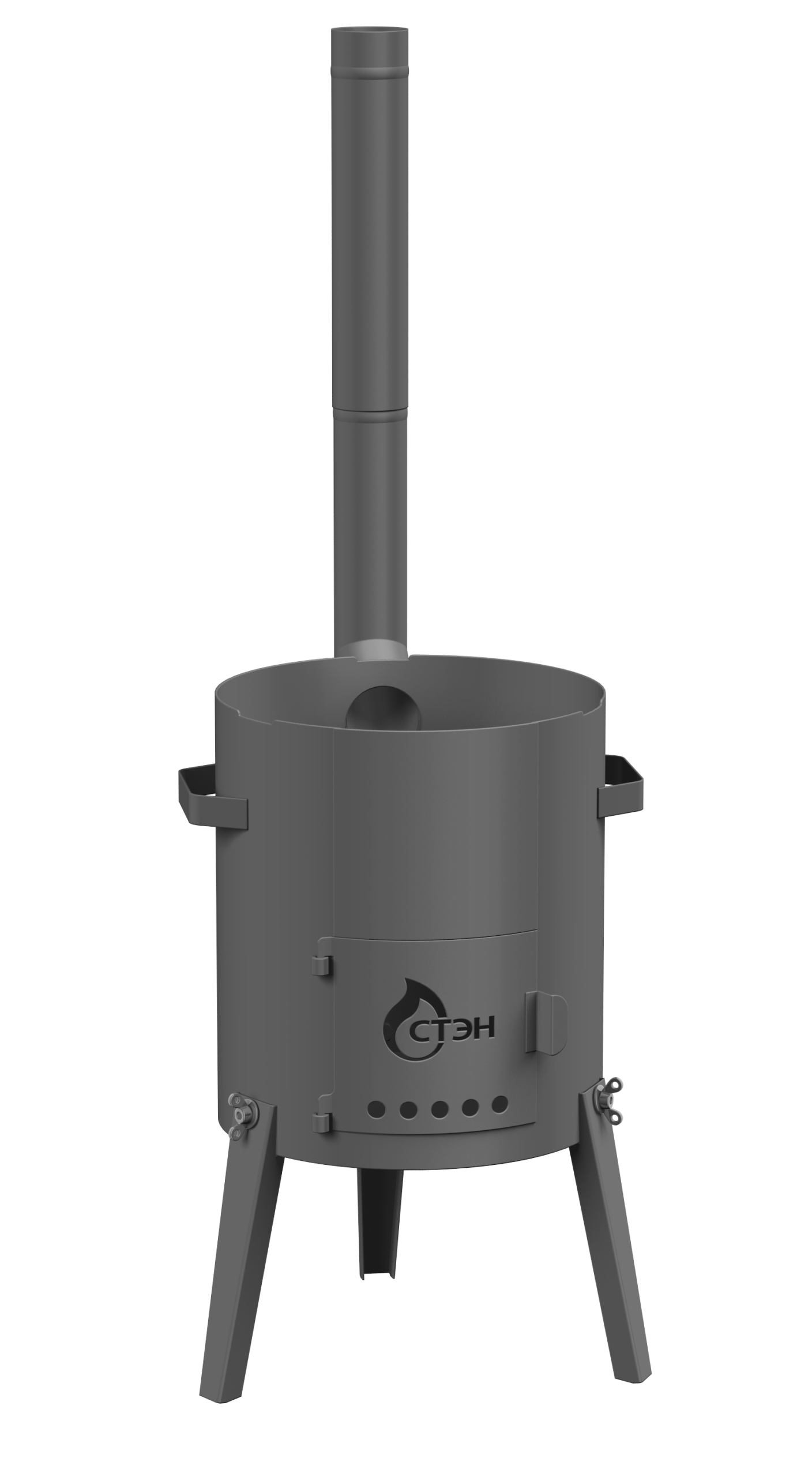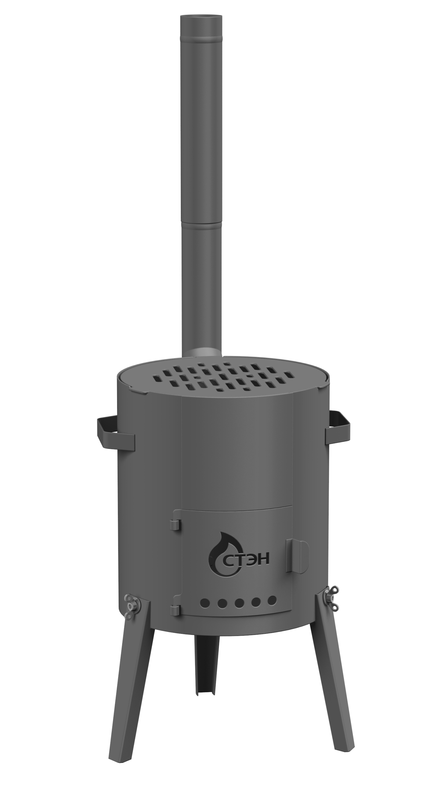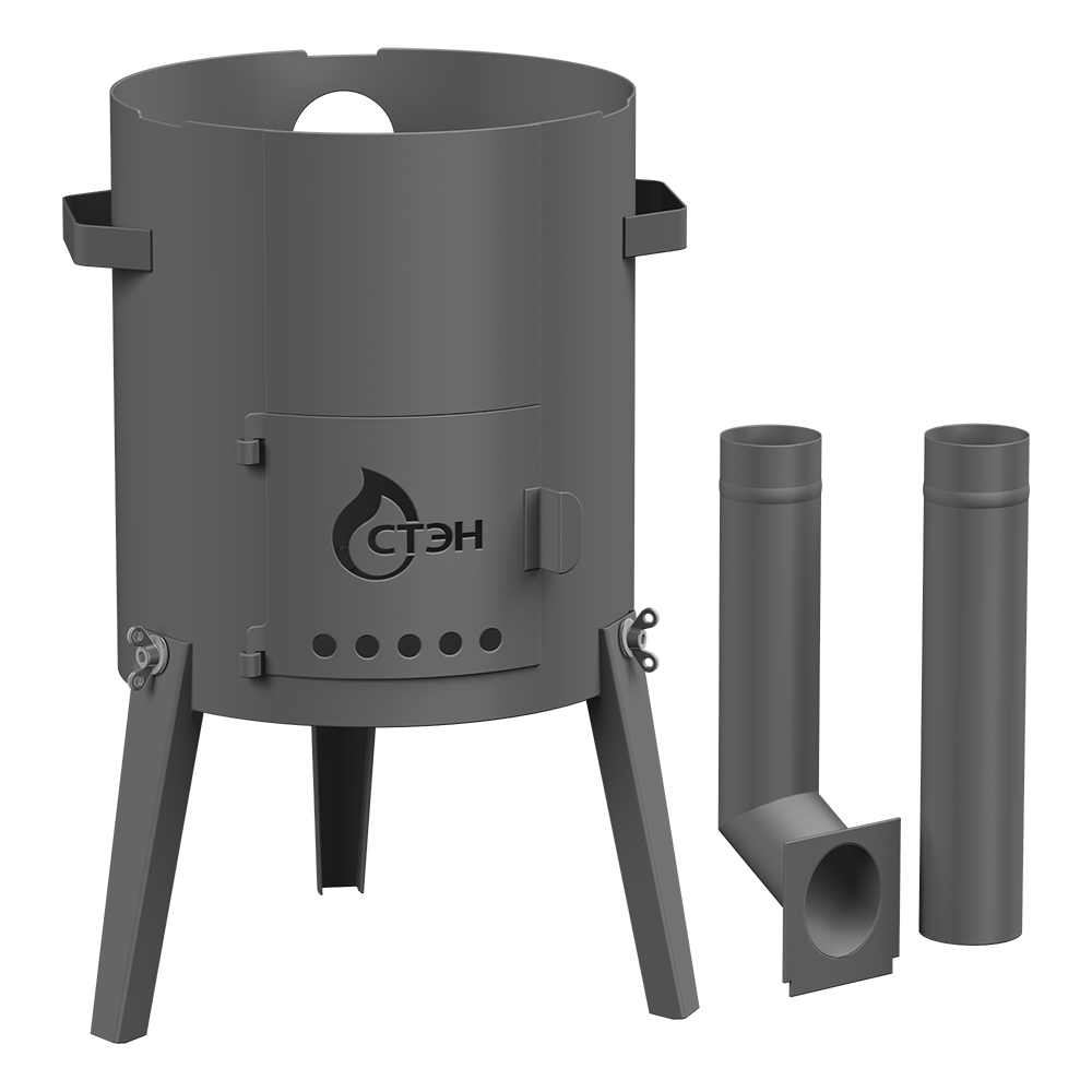 Переносная печь для приготовления пищи в казане, сковороде, кастрюле, котелке, чайнике. Используется только на открытом воздухе. Снабжена разборной трубой, плитой-гриль, дверцей, а также ручками для переноски. Складная конструкция облегчает транспортировку.