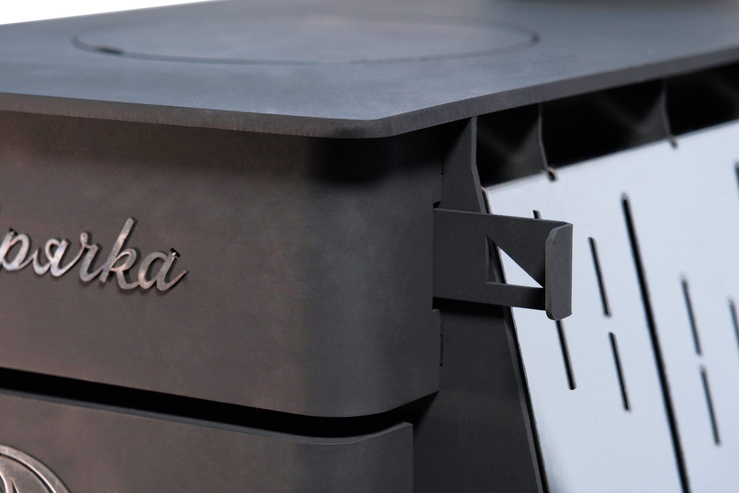 - Надёжность: стенки печи изготовлены из стали марки Ст.3 СП 5 толщиной 3 мм, варочная плита — из стали толщиной 6 мм, а кожух — из нержавеющей стали AISI 430 (толщина 0,8 мм), что обеспечивает долговечность и устойчивость к высоким температурам.