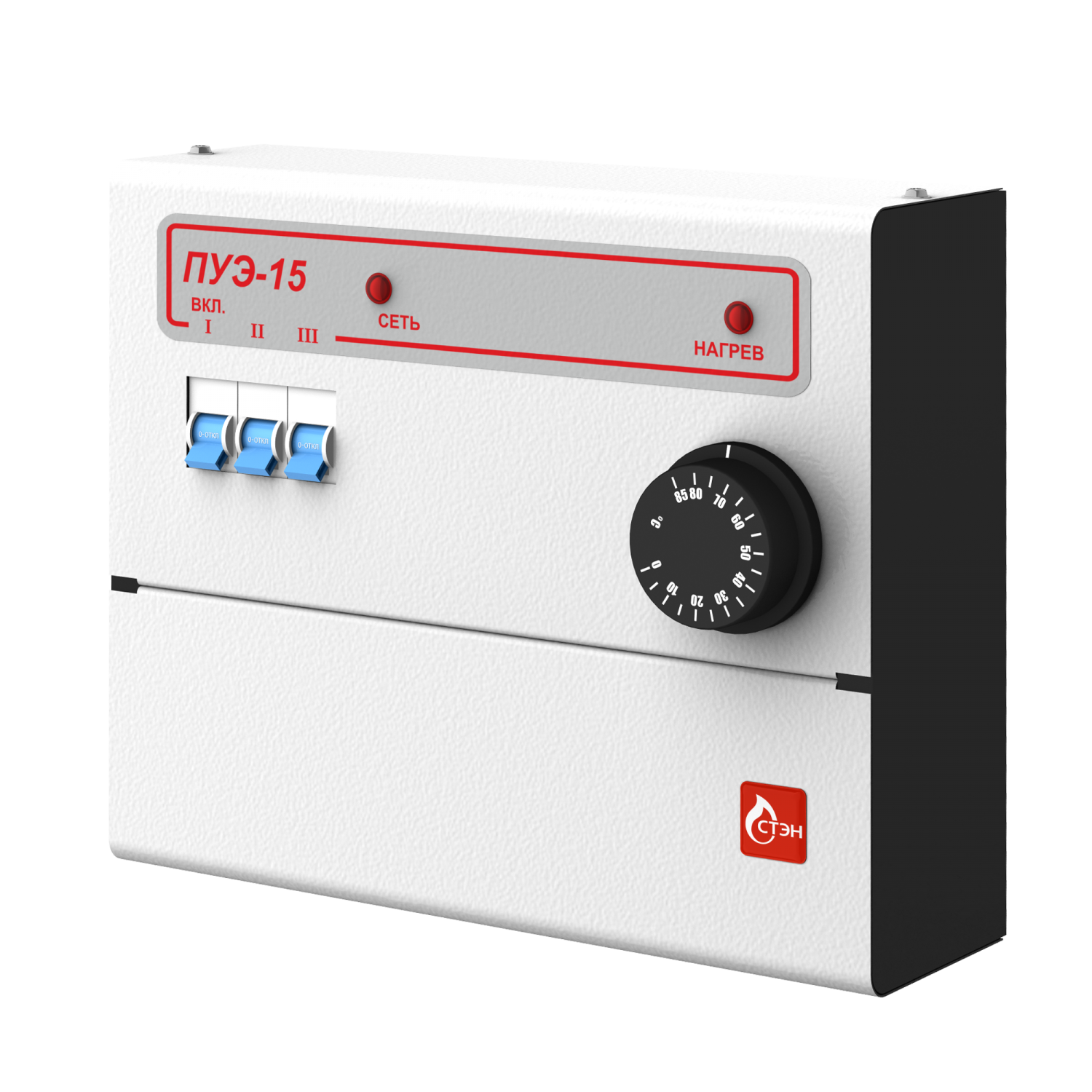 ПУЭ-15 применяется для управления температурой теплоносителя в котлах при использовании трехступенчатого электронагревательного элемента типа ТЭНБ мощностью до 15 кВт.