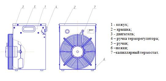 Конструкция прибора продумана до мелочей: прямоугольный корпус вмещает ТЭНы, двигатель с вентилятором и панель управления. Безопасность эксплуатации обеспечивается встроенным термовыключателем (датчиком), который предотвращает перегрев устройства.