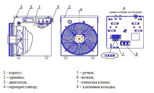 Конструкция прибора продумана до мелочей: прямоугольный корпус вмещает ТЭНы, двигатель с вентилятором и панель управления. Безопасность эксплуатации гарантирована наличием термовыключателя (датчика), предотвращающего перегрев устройства. Функциональность модели дополнена возможностью переключения мощности при помощи клавишных выключателей и наличием терморегулятора для автоматического поддержания заданной температуры в помещении.