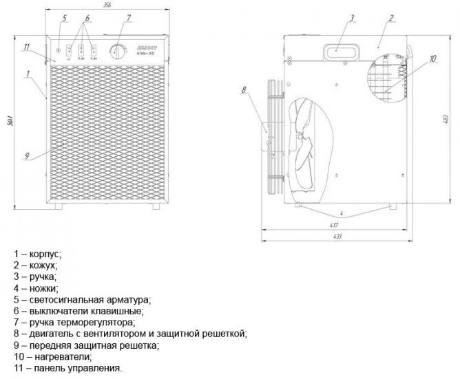 Конструкция прибора продумана до мелочей: прямоугольный корпус вмещает ТЭНы, двигатель с вентилятором и панель управления. Безопасность эксплуатации гарантирована встроенным термовыключателем (датчиком), предотвращающим перегрев устройства.