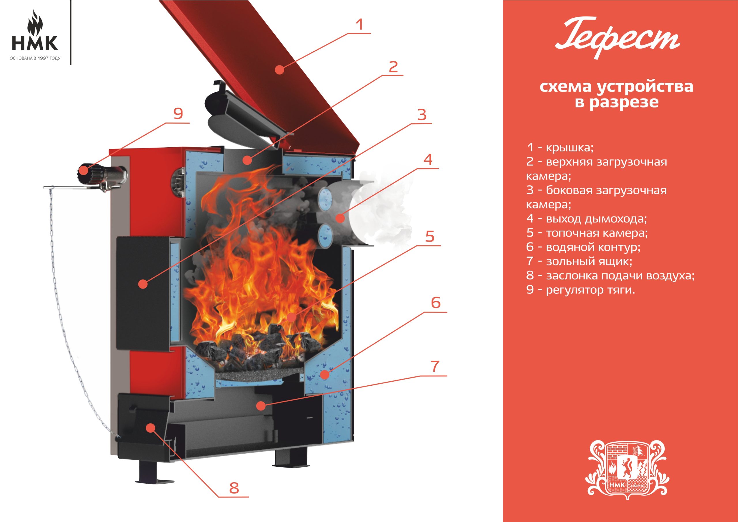 Для автоматического управления подачей воздуха в камеру сгорания на дверце зольника установлена воздушная заслонка, через цепочку управляемая энергонезависимым терморегулятором. В верхней части котла «Гефест» 20 кВт имеется загрузочный люк, который облегчает работу по закладке топлива в топочную камеру.