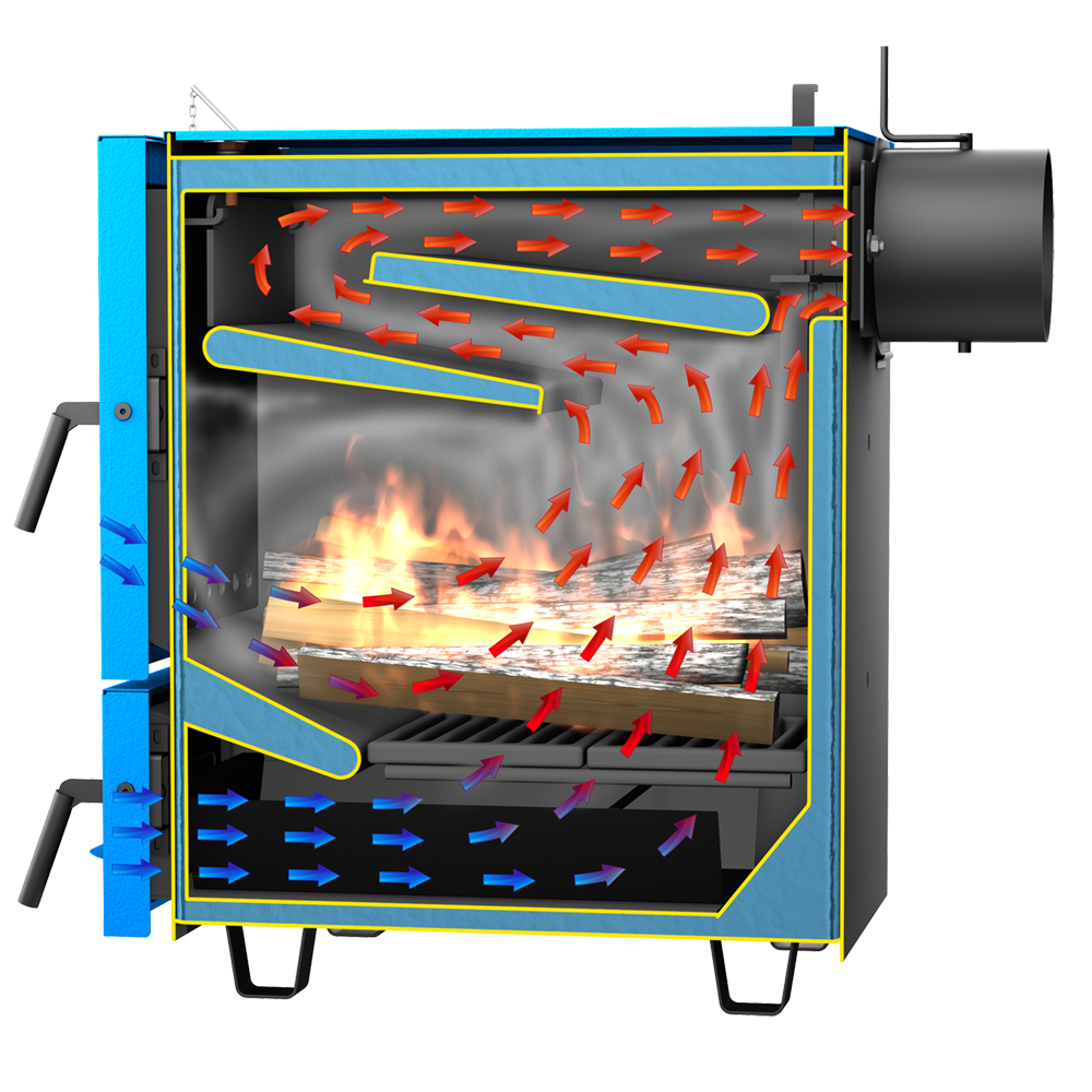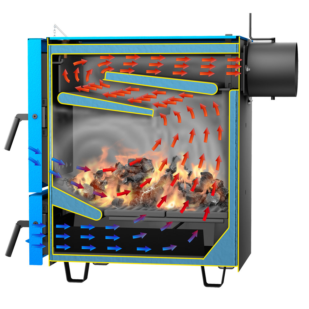 - Трёхходовая конструкция топки с увеличенной поверхностью теплосъёма