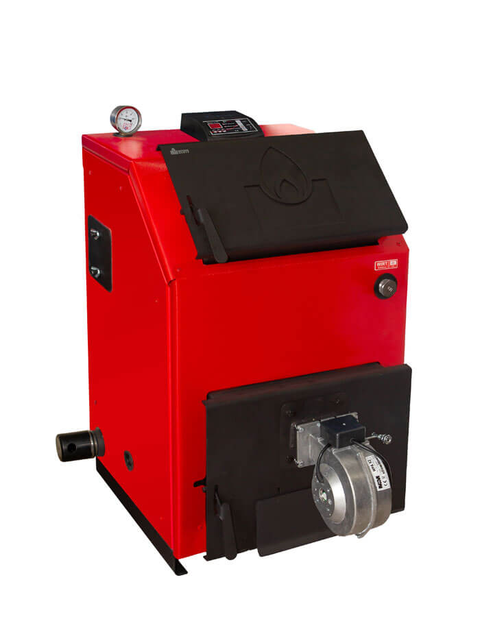 - Универсальность. При установке пульта управления и снятии заглушки с нижней двери котёл совместим с наддувной газовой, жидкотопливной или пеллетной горелками. Также есть место для блока ТЭН, мощность которого может достигать 60 % от номинальной мощности котла.