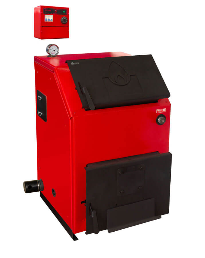 - Надёжность, долговечность и безопасность. Топочная камера и отражатели выполнены из толстолистовой стали (4 мм). Усиленные загрузочная и топочная двери оснащены огнеупорными материалами (картон и шнур из керамического стекловолокна, толщина — 20 мм, максимальная температура — 1260 °C), что минимизирует риск ожогов и поддымлений. Негорючая теплоизоляция (50 мм) и защитный кожух с полимерной краской позволяют устанавливать котёл в неотапливаемых помещениях без потери мощности. Расчётный срок службы при соблюдении правил эксплуатации составляет 15–20 лет.