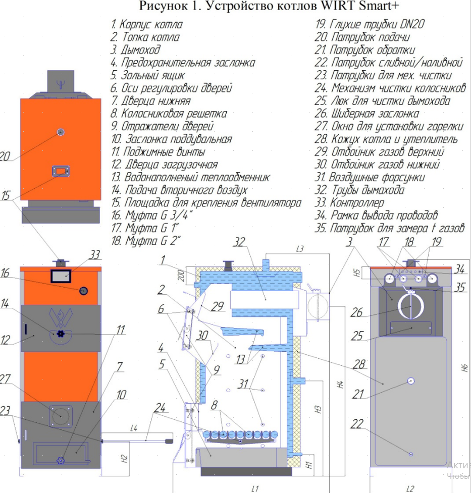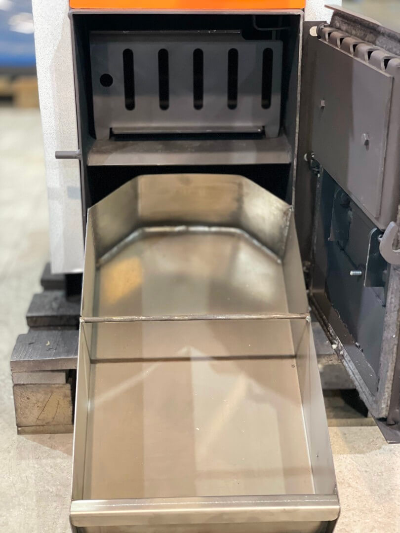 - Удобство обслуживания. Очистка котла упрощена: под колосниковой решёткой расположен механизм очистки и большой зольный ящик. Колосниковую решётку можно чистить без открывания дверей котла. Боковые заглушки обеспечивают быстрый доступ к камере сгорания для очистки поверхностей нагрева.
