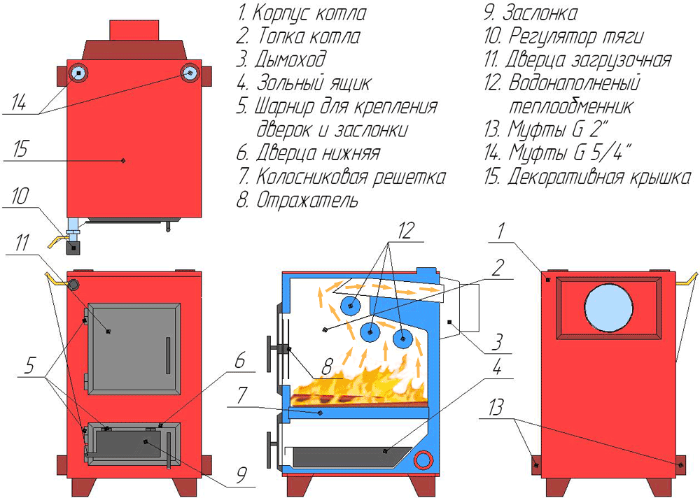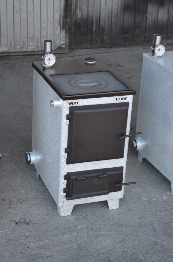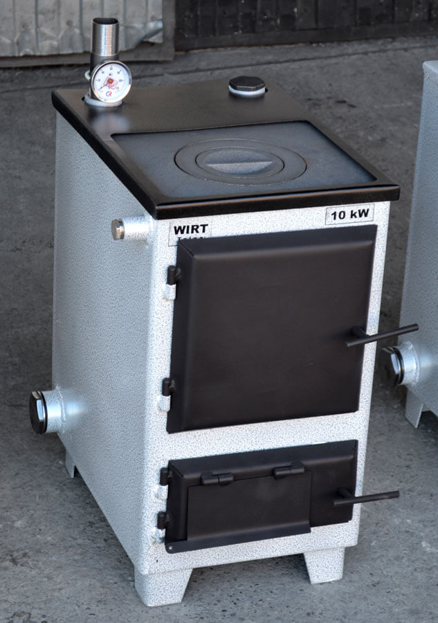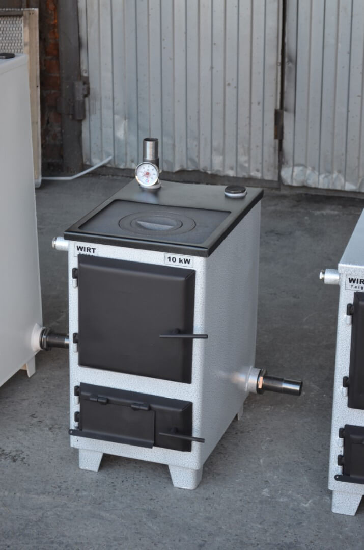 - Универсальность топлива: работа на твёрдом топливе (уголь, дрова, торфяные брикеты) в базовой комплектации и возможность перехода на газ, дизельное топливо или электричество.