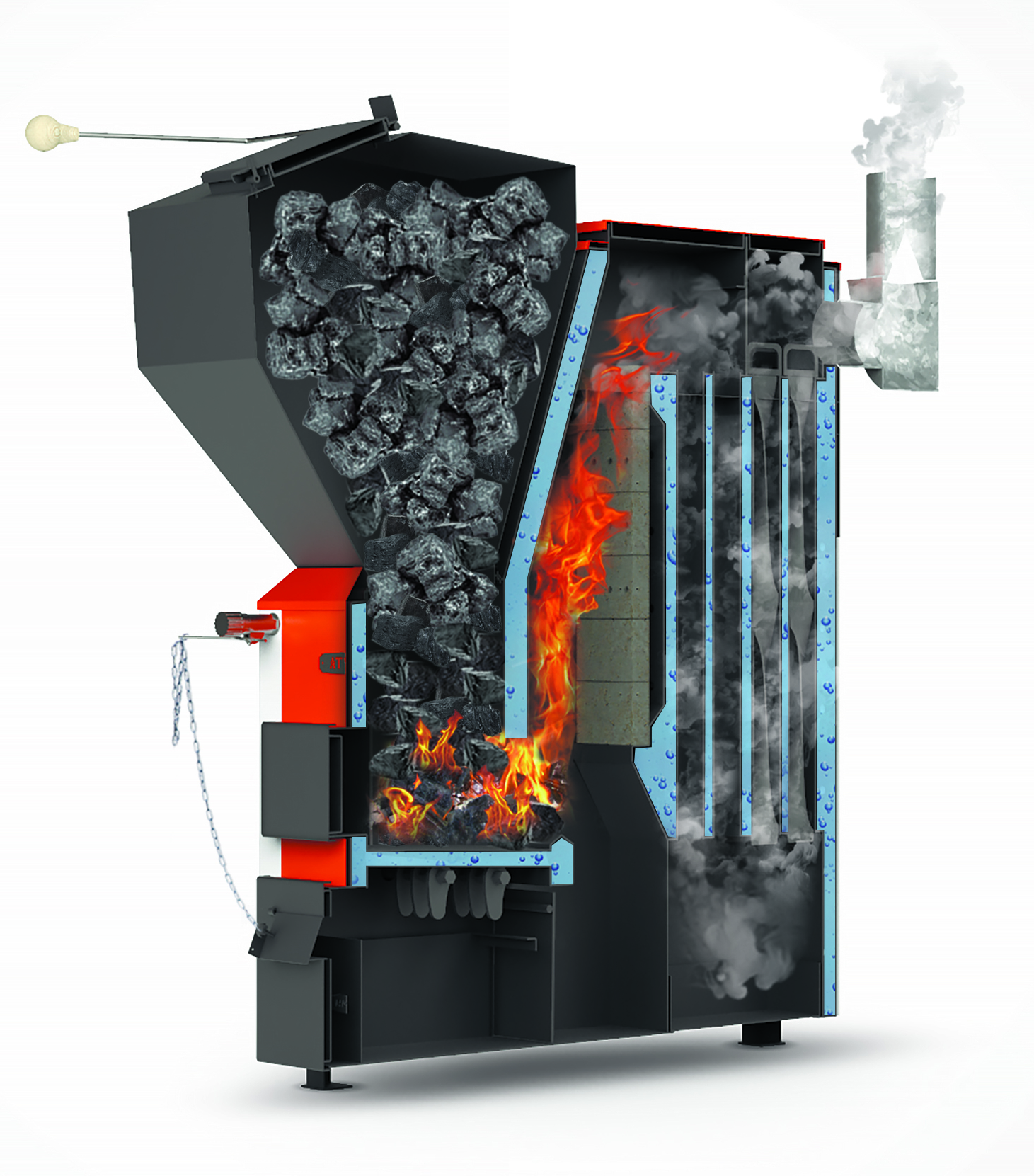 - Технологичность: наличие камеры вторичного сжигания, трёхходовое движение пламени, водоохлаждаемые колосники треугольного сечения, прочистные толкатели в автоматическом и ручном режимах.