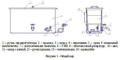 Конструкция устройства объединяет функциональность и простоту использования: это пластмассовая ёмкость со съёмной крышкой, внутри которой размещён нагревательный элемент из нержавеющей стали. Блок управления с клавишным выключателем и терморегулятором расположен в нижней части, а на передней панели находится кран для подачи воды. Шнур питания выведен на заднюю стенку прибора.